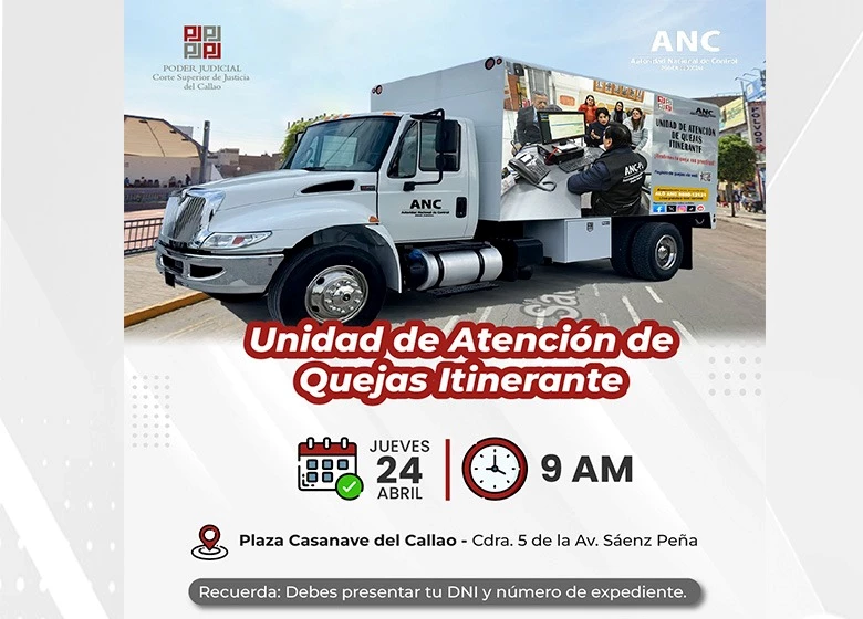 Con el objetivo de acercar la justicia a la ciudadanía y garantizar una atención oportuna a los reclamos de los usuarios, la Autoridad Nacional de Control del Poder Judicial (ANC-PJ) llevará su Unidad de Atención de Quejas Itinerante (UAQI) al distrito judicial del Callao este jueves 24 de abril.