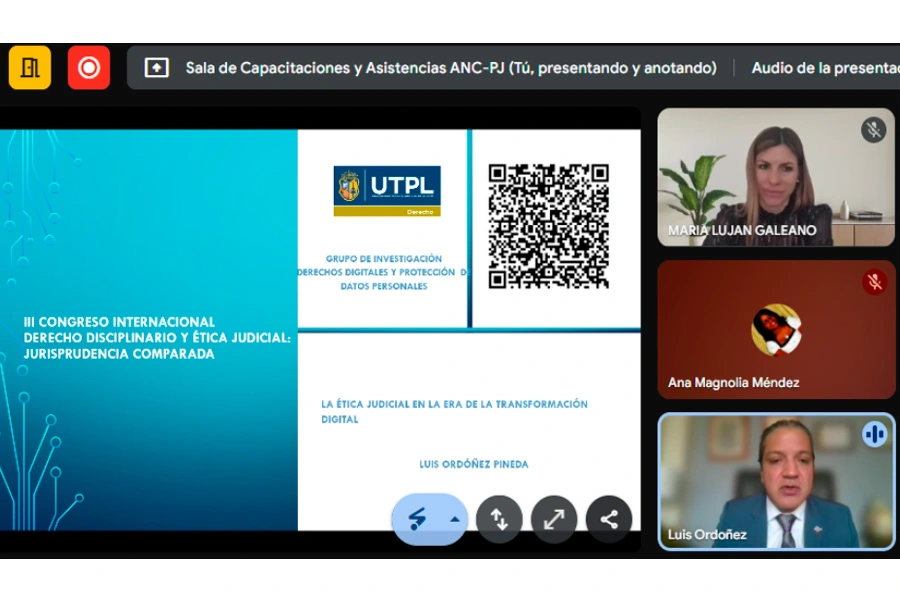 Finalmente, el doctor Luis Ordóñez, docente-investigador de la Universidad Técnica Particular de Loja (Ecuador), cerró la jornada con la ponencia “La ética judicial en la era de la transformación digital”, destacando la importancia de la integridad y la responsabilidad en el uso de tecnologías emergentes.