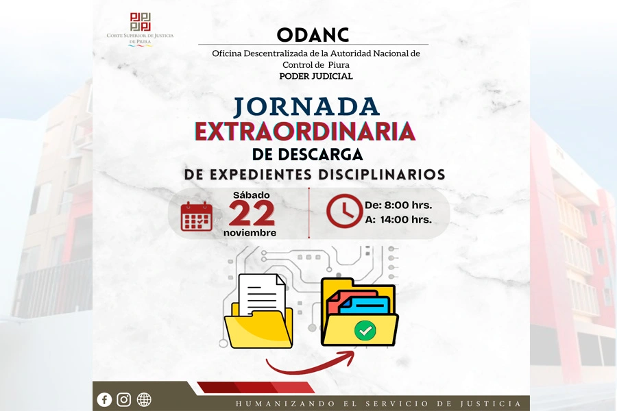 La Oficina Descentralizada de la Autoridad Nacional de Control (ODANC) de Piura llevará a cabo este sábado 22 de noviembre una Jornada Extraordinaria de Descarga de Procesos Disciplinarios, que se desarrollará desde las 08:00 hasta las 14:00 horas en su sede institucional.