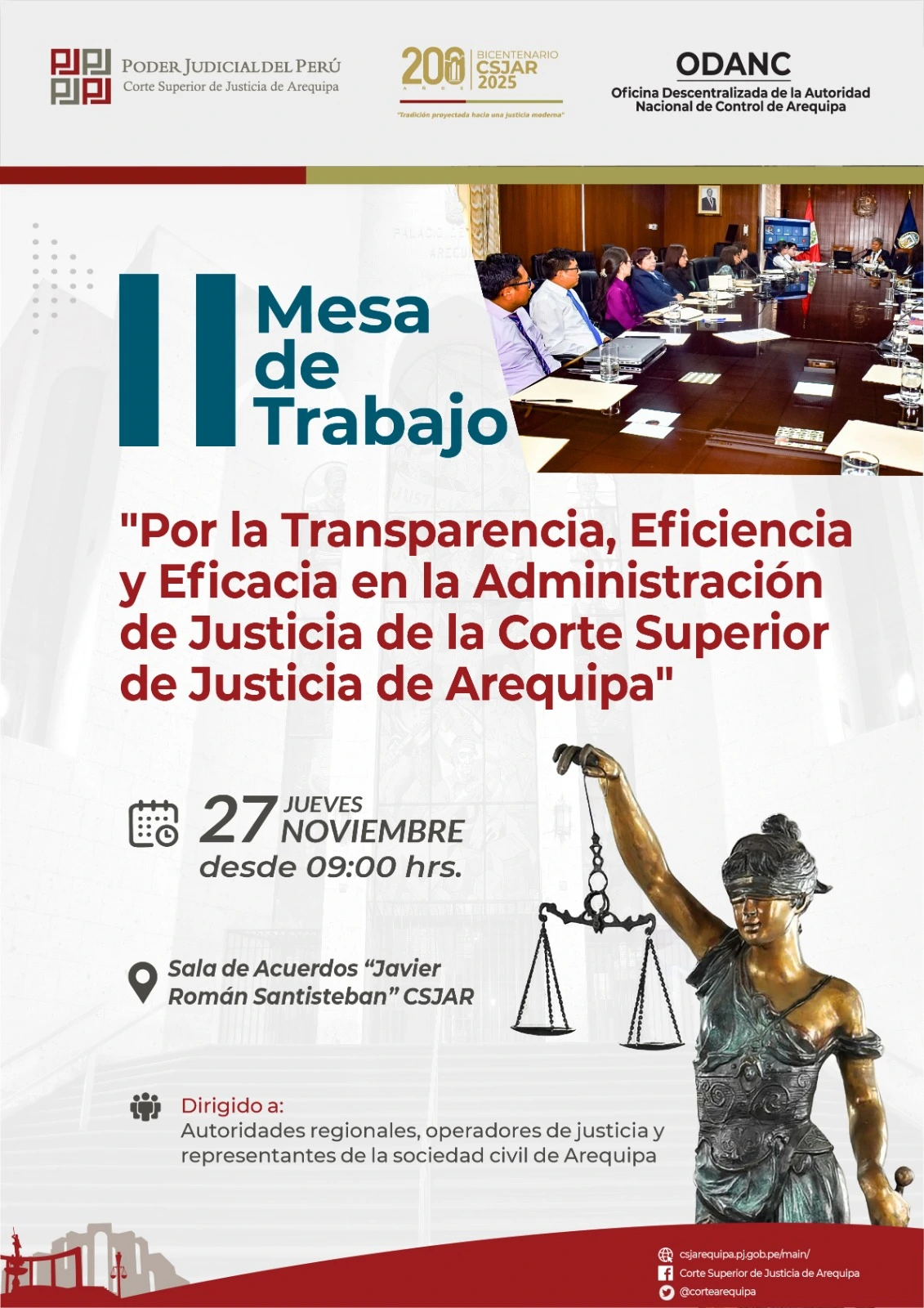 Desde las 09:00 horas, del día jueves 27 de noviembre de 2025, se llevará a cabo la Segunda Mesa de Trabajo titulada "Por la Transparencia, Eficiencia y Eficacia en la Administración de Justicia de la Corte Superior de Justicia de Arequipa", la cual viene siendo organizada por la Oficina Descentralizada de la Autoridad Nacional de Control de Arequipa, y que tendrá como lugar la Sala de Acuerdos "Javier Román Santisteban" ubicada en las instalaciones de la CSJAR. Asimismo, esta Mesa de Trabajo estará dirigida a las Autoridades regionales, operadores de justicia y representantes de la sociedad civil de Arequipa.