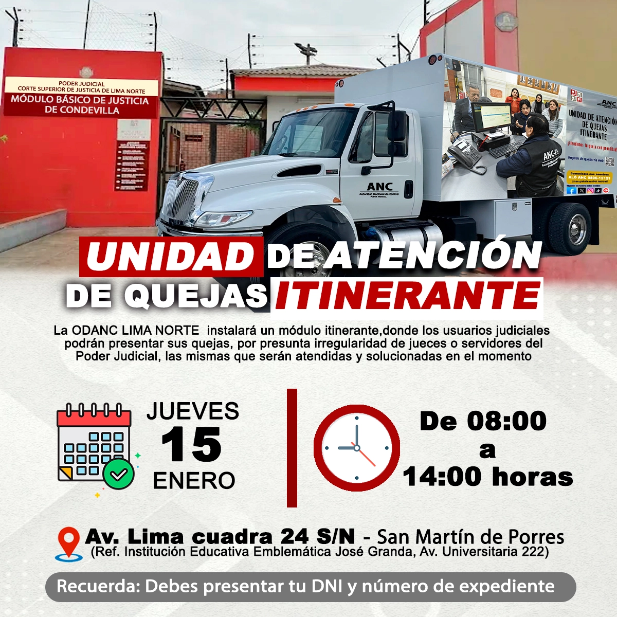 UNIDAD DE ATENCIÓN DE QUEJAS ITINERANTE (UAQI) DE LA ANC-PJ ATENDERÁ EN SAN MARTÍN DE PORRES ESTE JUEVES 15 DE ENERO