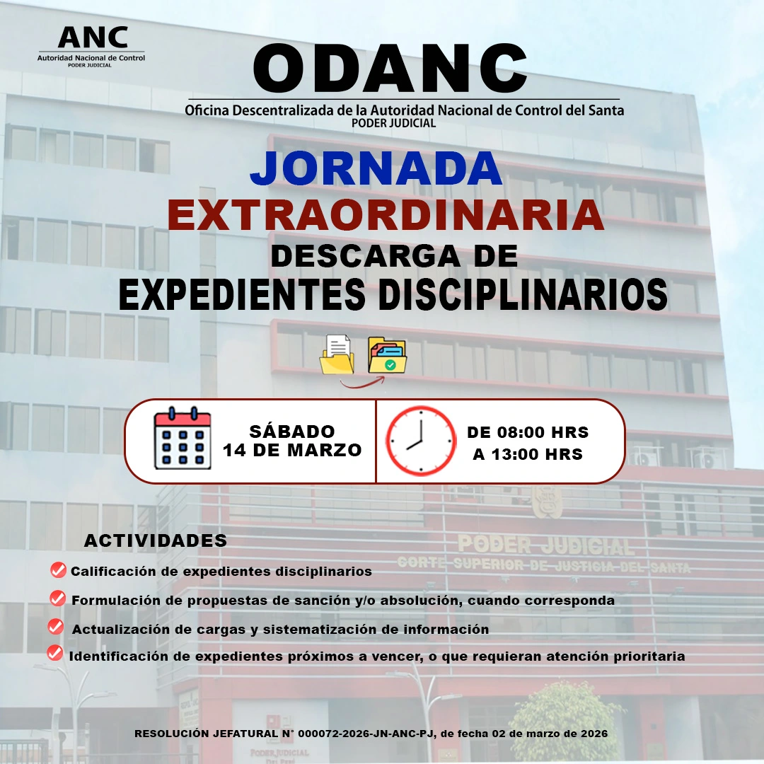 La Oficina Descentralizada de la Autoridad Nacional de Control (ODANC) del Santa realizará mañana sábado 14 de marzo una Jornada Extraordinaria de Descarga de Expedientes Disciplinarios, que se desarrollará desde las 08:00 a.m. hasta las 1:00 p.m. en su sede institucional.