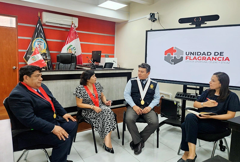 Durante la jornada, sostuvieron una reunión de coordinación con el fiscal coordinador, Joan Manuel Balladares Correa, y con la administradora del módulo, Mariela Tantaleán Olano, con el objetivo de fortalecer la articulación interinstitucional y optimizar los mecanismos de atención en los procesos de flagrancia, como parte de las acciones preventivas de control funcional.