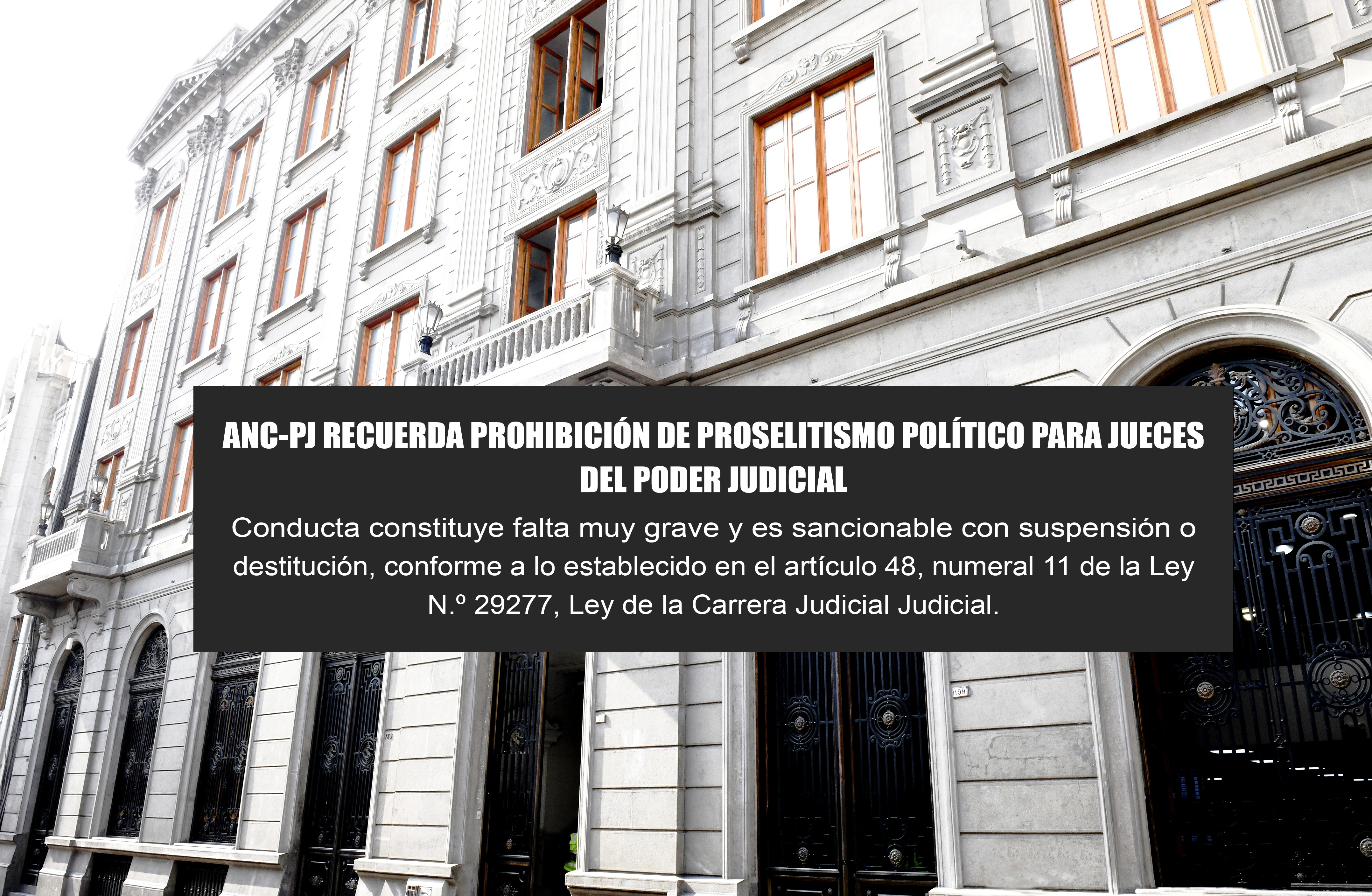 La Autoridad Nacional de Control del Poder Judicial (ANC-PJ), a través de la Unidad de Prevención, Supervisión e Inspección, recuerda a los jueces del Poder Judicial, con excepción de los jueces supremos, la prohibición de realizar proselitismo político en el ejercicio de la función jurisdiccional, conforme a lo establecido en el artículo 48, numeral 11 de la Ley N.º 29277, Ley de la Carrera Judicial.
