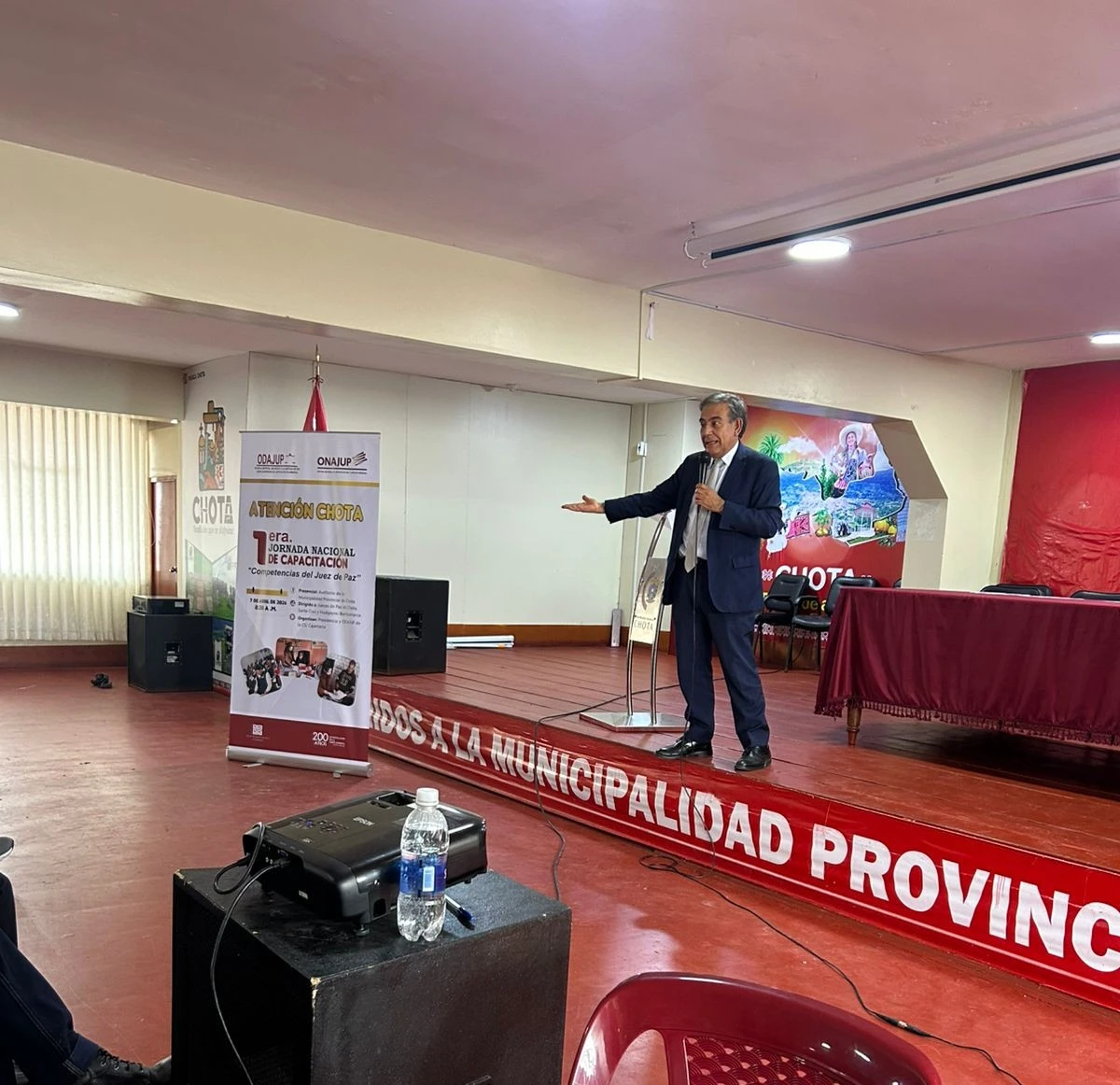 Como parte de su agenda, participó como expositor en la Primera Jornada de Capacitación “Competencias del Juez de Paz”, dirigida a jueces de paz de las provincias de Chota, Hualgayoc y Santa Cruz, donde abordó el tema del régimen disciplinario aplicable a esta función.